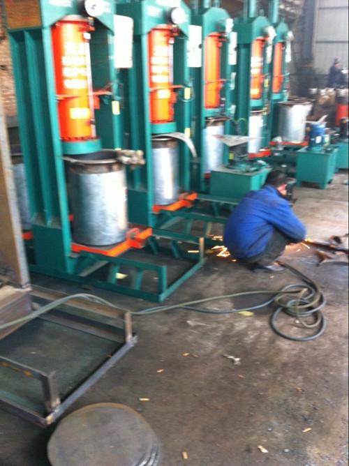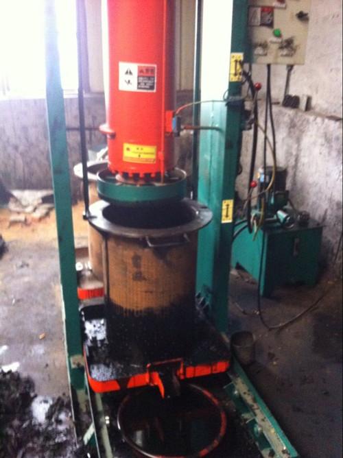 自動(dòng)加壓二到三次,油已榨盡時(shí),按鈕再轉(zhuǎn)換到停止上,上換向閥桿向里緩慢推卸壓,卸壓后把兩邊提筒連接豎桿與料筒上的鏈接口相吻合,轉(zhuǎn)換手動(dòng)啟動(dòng),然后把下?lián)Q向閥粉閥桿外拉,帶動(dòng)豎桿和料筒上移直至油餅完全脫離料筒落在接油盤上,然后拉出接油盤推到托架上,把油紙拿出,然后把上換向閥桿向里推進(jìn),使大油缸工作帶動(dòng)壓油盤上升,脫離料筒至帶壓狀態(tài),接油盤和料筒再拉到框架的托架上,等待下次裝料,預(yù)備下一次壓榨工作。用一個(gè)星期把料筒外護(hù)罩去掉,把料筒外壁油渣清理干凈。